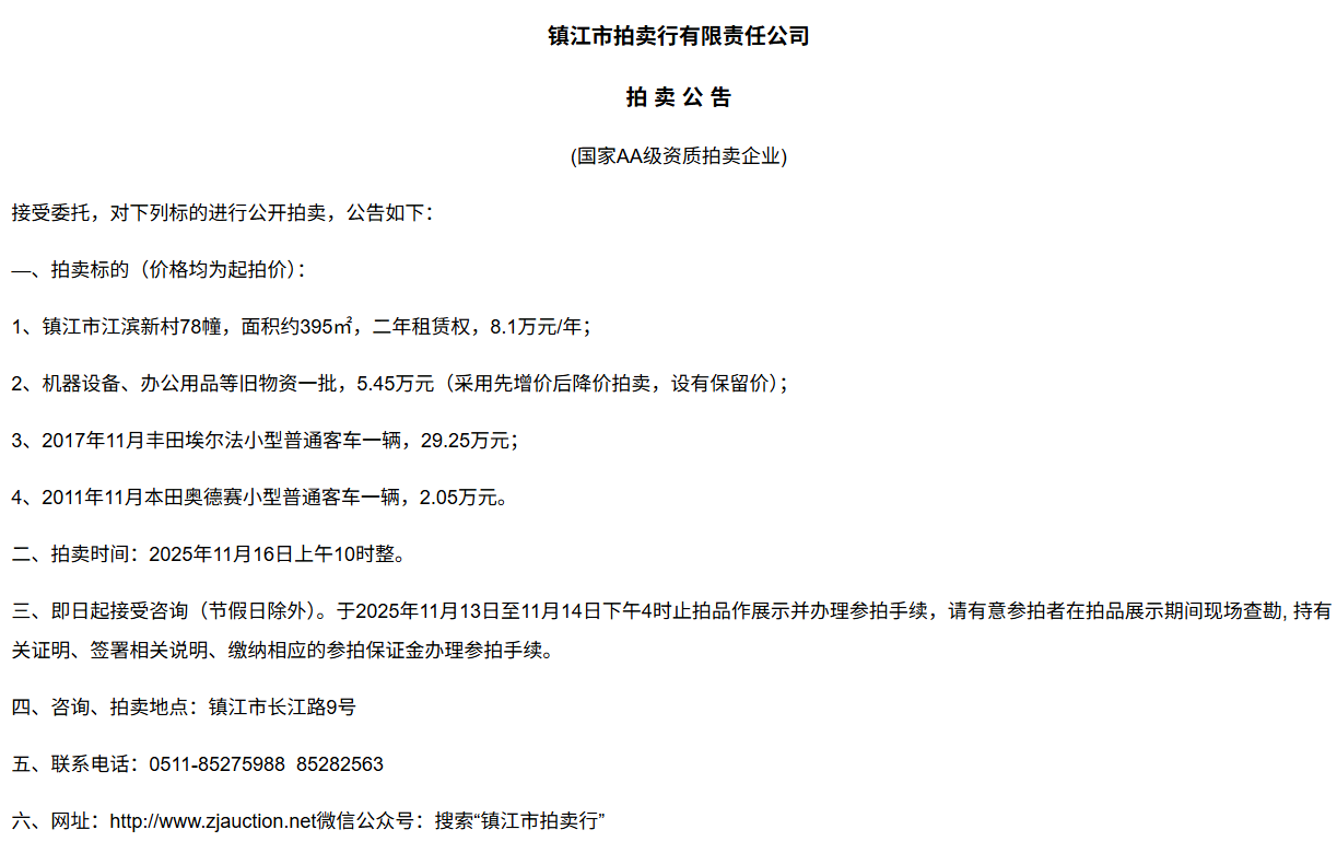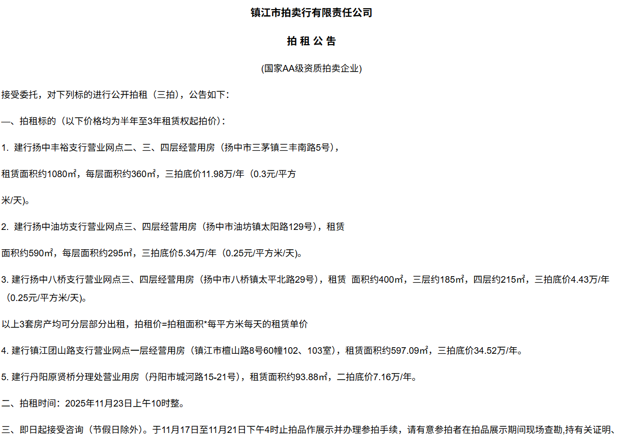 鎮江市拍賣行有限責任公司拍 租 公 吿(國家AA級資質拍賣企業)接受委托,對下列標的進行公開拍租(三拍),公告如下:—、拍租標的(以下價格均為半年至3年租賃權起拍價):1.  建行揚中豐裕支行營業網點二、三、四層經營用房(揚中市三茅鎮三豐南路5號),租賃面積約1080㎡,每層面積約360㎡,三拍底價11.98萬/年(0.3元/平方米/天)。2.  建行揚中油坊支行營業網點三、四層經營用房(揚中市油坊鎮太陽路129號),租賃面積約590㎡,每層面積約295㎡,三拍底價5.34萬/年(0.25元/平方米/天)。3. 建行揚中八橋支行營業網點三、四層經營用房(揚中市八橋鎮太平北路29號),租賃  面積約400㎡,三層約185㎡,四層約215㎡,三拍底價4.43萬/年(0.25元/平方米/天)。以上3套房產均可分層部分出租,拍租價=拍租面積*每平方米每天的租賃單價4. 建行鎮江團山路支行營業網點一層經營用房(鎮江市檀山路8號60幢102、103室),租賃面積約597.09㎡,三拍底價34.52萬/年。5. 建行丹陽原賢橋分理處營業用房(丹陽市城河路15-21號),租賃面積約93.88㎡,二拍底價7.16萬/年。二、拍租時間:2025年11月23日上午10時整。三、即日起接受咨詢(節假日除外)。于11月17日至11月21日下午4時止拍品作展示并辦理參拍手續,請有意參拍者在拍品展示期間現場查勘,持有關證明、簽署相關說明、繳納相應的參拍保證金辦理參拍手續。四、咨詢、拍租地點:鎮江市長江路9號五、聯系方式:0511-85275988   13655299933楊先生六、網址:http://www_zjauction_net.aucular.com;微信公眾號:搜索“鎮江市拍賣行” 拍品清單2025.11.23序號名稱起拍價(元)標的說明1建行揚中豐裕支行營業網點二、三、四層經營用房(揚中市三茅鎮三豐南路5號),租賃面積約1080㎡,每層面積約360㎡三拍底價11.98萬/年(0.3元/平方米/天)1、1-3號房產均可分層部分出租,拍租價=拍租面積*每平方米每天的租賃單價;2、意向競拍人在拍賣前需持營業執照或身份證與委托方說明租賃房產經營業態,確定意向后出具房產承租用途承諾書,經委托方審核后,方可交納保證金參加競拍;3、租賃期限為半年至3年(承租方與出租方協商而定),承租方每半年或一年結付租金,租賃期間的水、電費用及其它相關費用均由承租方承擔;4、承租方不得用于經營和保管危險物品,不得用于開設餐飲、娛樂等可能嚴重影響消防安全、運營安全的經營業態,不得用于經營委托貸款、小額貸款等可能冒用委托方名義,帶來聲譽風險的經營業態。租賃期內,承租方不得破壞墻體結構,自行成就消防、安全等使用條件,不得擅自將租賃房屋轉租、轉讓給他人使用,否則委托方有權收回房屋;5、拍租成交后,承租方將租金交至出租方指定賬戶,傭金交至拍賣方賬戶(拍租傭金為該房屋一個月租金)。承租方憑租賃合同無息退還保證金。2建行揚中油坊支行營業網點三、四層經營用房(揚中市油坊鎮太陽路129號),租賃面積約590㎡,每層面積約295㎡三拍底價5.34萬/年(0.25元/平方米/天)3建行揚中八橋支行營業網點三、四層經營用房(揚中市八橋鎮太平北路29號),租賃面積約490㎡,每層面積約245㎡三拍底價4.43萬/年(0.25元/平方米/天)4建行鎮江團山路支行營業網點一層經營用房(鎮江市檀山路8號60幢102、103室),建筑面積約597.09㎡三拍底價34.52萬/年5建行丹陽原賢橋分理處營業用房(丹陽市城河路15-21號),建筑面積約93.88㎡二拍底價7.16萬/年